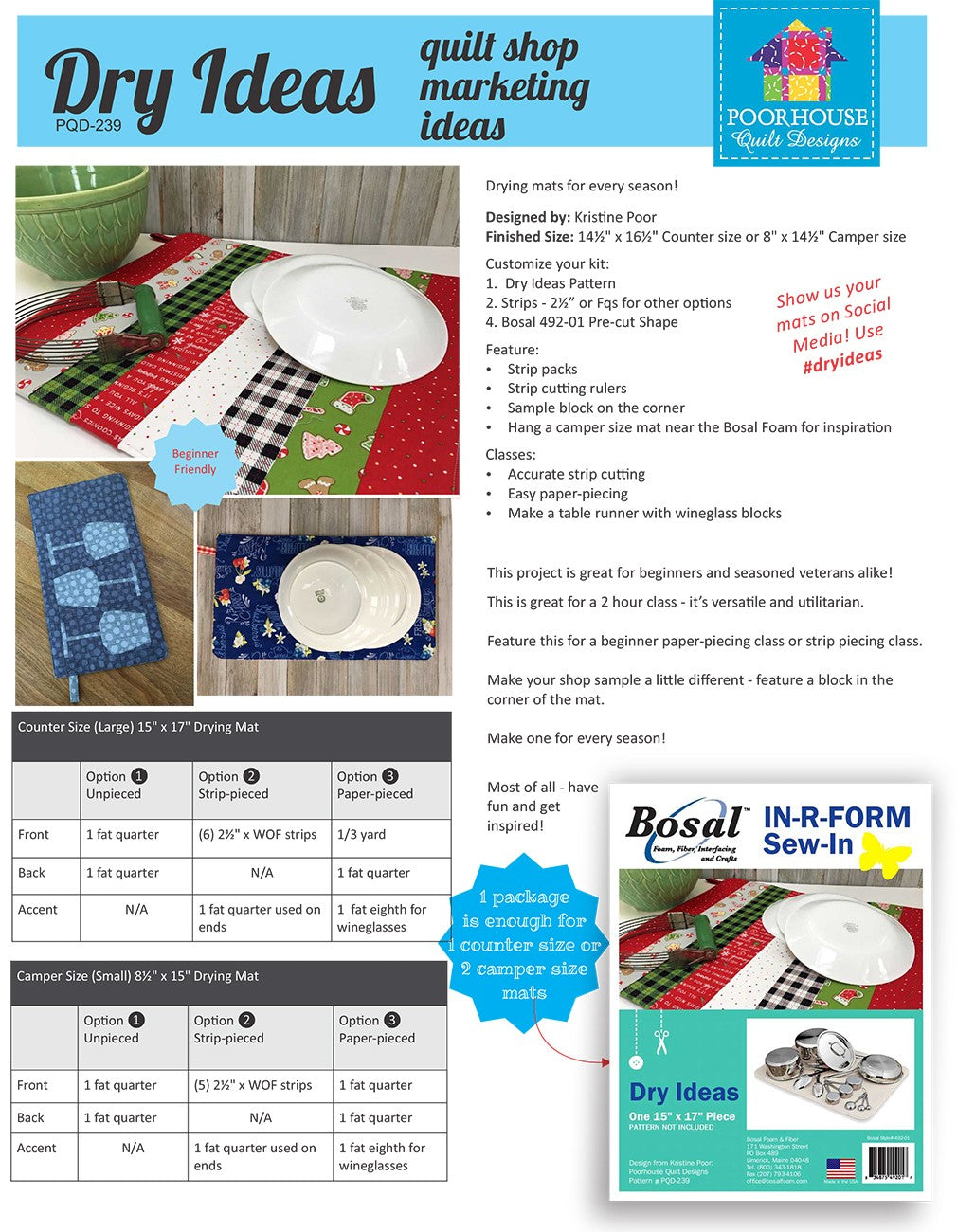 Make personalized dish drying mats for every season! Uses Bosal 492-01 precut mat. Unpieced, strip-pieced or paper-pieced. Excellent beginner paper-piecing technique class, as well as use as a beginner strip cutting class. Finished Size: 14-1/2in x 16-1/2in or 8in x 14-1/2in