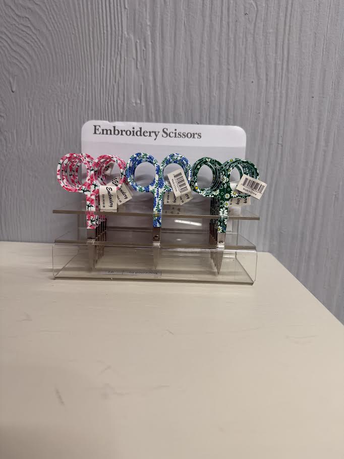 Embroidery Scissors Counter Display. Printed handles with assorted designs. Fine tipped straight blades, perfect for cutting threads.