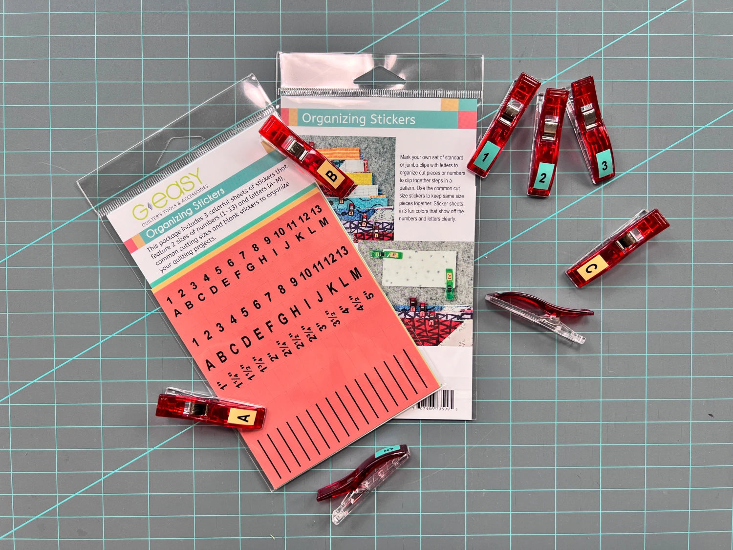 The stickers will be just as helpful and useful as our GEasy Ruler Stickers, and just like our GEasy Ruler Stickers, they are reusable and do not leave a residue behind. The stickers come with three colorful sheets that feature 2 sizes of numbers (1-13) and Letters (A-M), common cutting sizes, and blank stickers to organize your quilting projects. They are great to use on wonder clips in the regular and jumbo size.