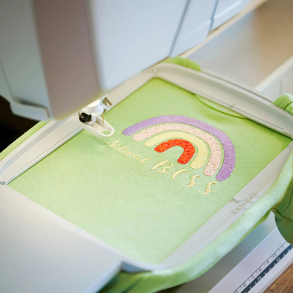 For the DESIGNER EPIC ™ 3 Sewing and Embroidery Machine, easily embroider tubular garments or items with a closed end (i.e. tote bags) without having to undo any seams. Innovative design allows projects to be positioned around the free arm and under the arm of the embroidery units. Clear markings on the hoop indicate the embroidery area.